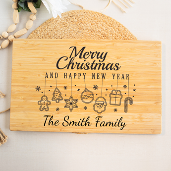 Celebrate the holidays with this festive custom bamboo cutting board! This beautiful wooden board features "Merry Christmas and Happy New Year" engraved along with your family name. It adds holiday cheer to your kitchen all season long.