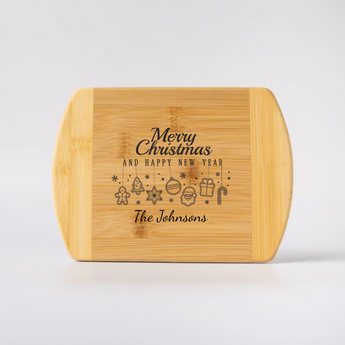 Celebrate the holidays with this festive custom bamboo cutting board! This beautiful wooden board features "Merry Christmas and Happy New Year" engraved along with your family name. It adds holiday cheer to your kitchen all season long.