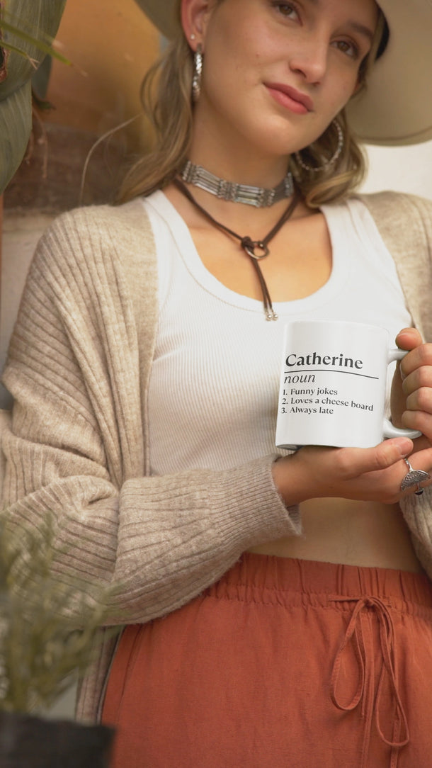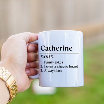 Start the day with a smile with our personalized definition coffee mug! Add any name and 3 funny or heartfelt traits to create a one-of-a-kind gift that’s sure to get laughs (and lots of use). Perfect for birthdays, holidays, coworkers, friends, or anyone who deserves a thoughtful and lighthearted surprise. This mug is both fun and practical — the perfect mix for a memorable gift. A great way to celebrate someone’s quirks, inside jokes, or unique personality!