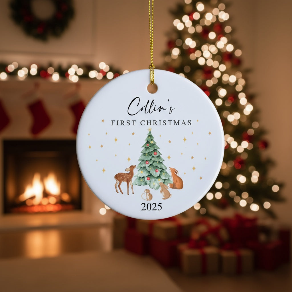 Celebrate baby's very first Christmas with this adorable personalized ornament! Features a beautiful Christmas design with your baby's name, "First Christmas," and the special date printed on high-quality ceramic.