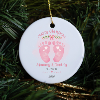 Announce your exciting baby news with this adorable Christmas ornament! Features "Merry Christmas Mommy and Daddy, See You In..." with your baby's expected arrival year printed in beautiful lettering.