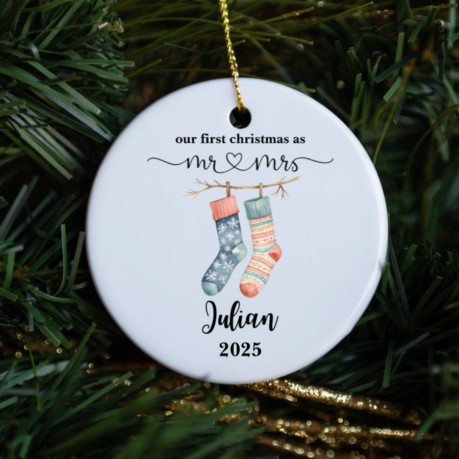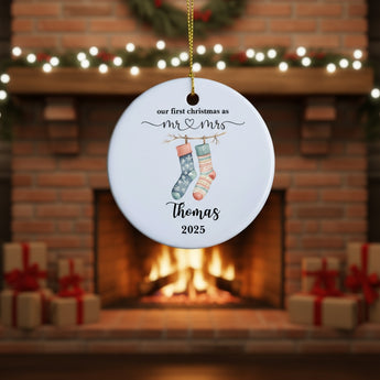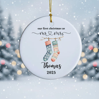 Celebrate your first Christmas as a married couple with this beautiful ceramic ornament! Features a festive Christmas stocking image with "Our First Christmas as Mr. and Mrs." and your names printed in elegant lettering.