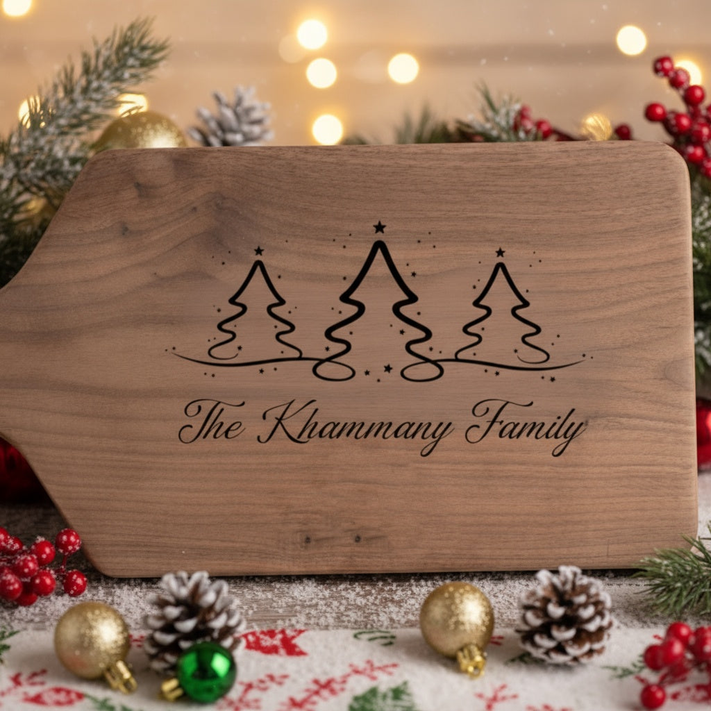 Bring holiday cheer to your kitchen with this beautiful dual-purpose cutting board! This versatile wooden board features one of our festive Christmas designs engraved on the surface. Use it for preparing holiday meals or create a stunning charcuterie display for your Christmas parties and gatherings.