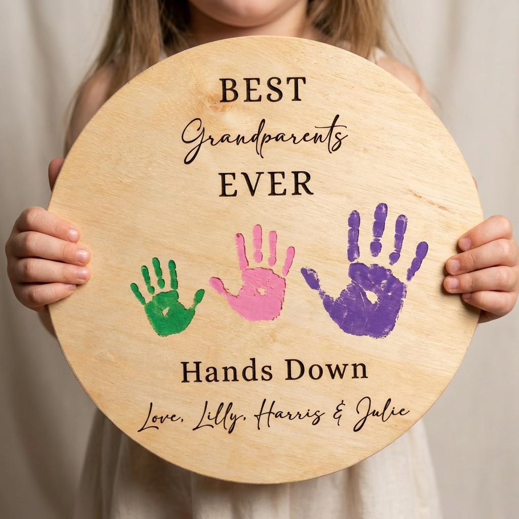Create a heartfelt keepsake that captures little hands and big love. This 11 inch Wood Circle Handprint Sign is a special gift for Grandparents. Designed for children’s painted handprints, it turns a simple craft into a memory that lasts forever.