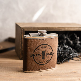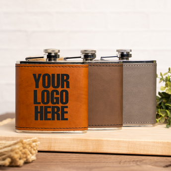 Carry your favorite drink in style with this vegan leather wrapped flask! This sleek hip flask features premium vegan leather wrapping with your custom logo or design engraved right into the surface. Perfect for celebrations, outdoor adventures, or keeping your spirits close.