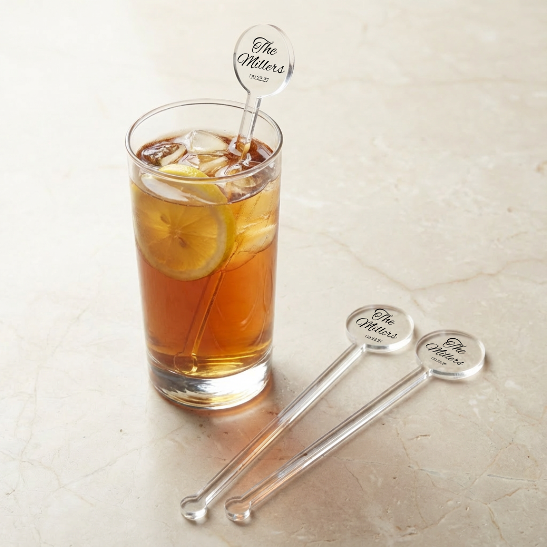 Available in sets of 25, 50, 100, 200, or 300, they’re great for weddings of all sizes, from small gatherings to large receptions. The clear acrylic gives a modern, elegant look, while the printed wedding design stays crisp and vibrant. These stir sticks pair perfectly with bars, drink stations, and welcome tables.