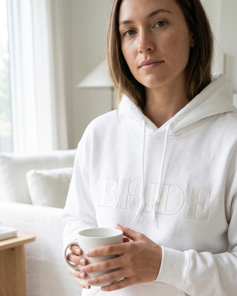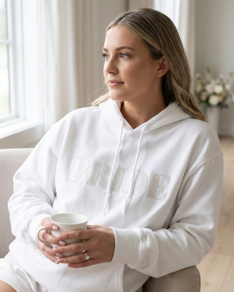 Celebrate your engagement with our adorable "Bride" hoodie! This cozy pullover features "Bride" embroidered across the front with your initials and your partner's initials beautifully displayed on the sleeve, creating a sweet personalized design that shows off your upcoming wedding.