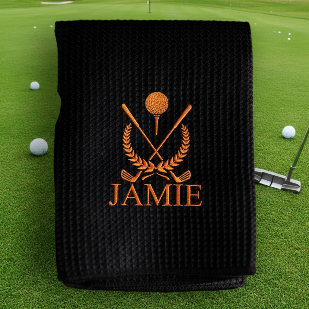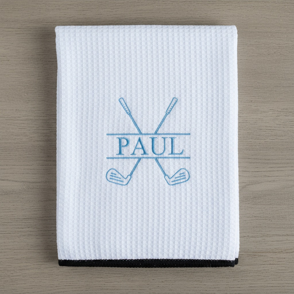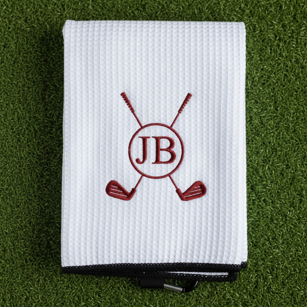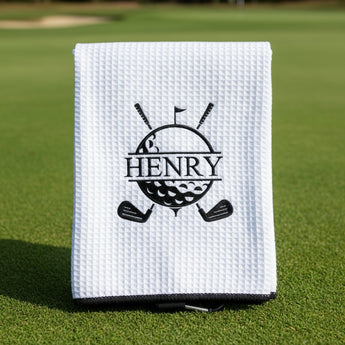 This embroidered golf towel makes the perfect gift for golfers. Personalize it with a name or initials. Made from soft, absorbent cotton and includes a metal hook for easy bag attachment. Ideal for groomsmen, Father's Day, or tournament giveaways. Stylish, functional, and custom-made to impress on the green.