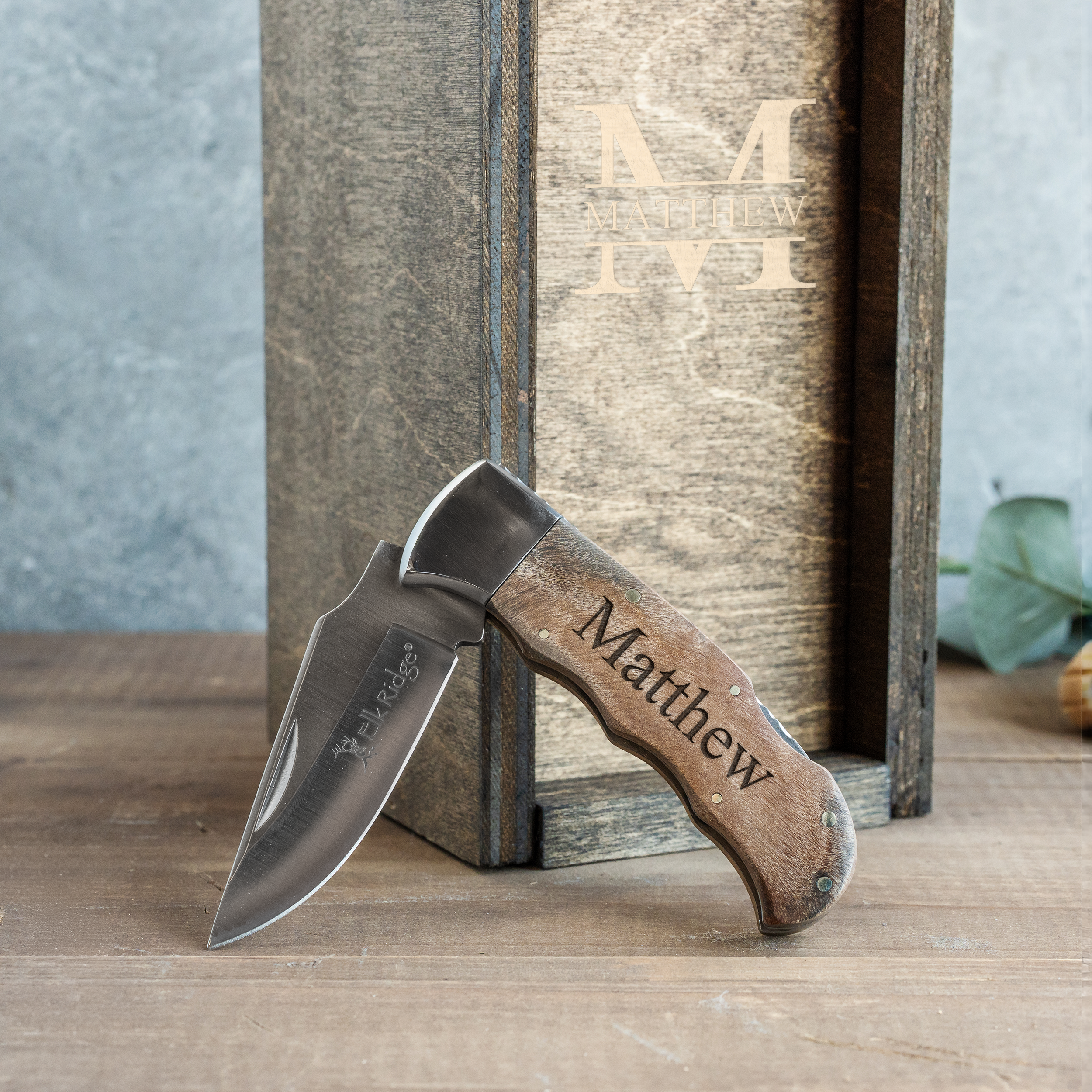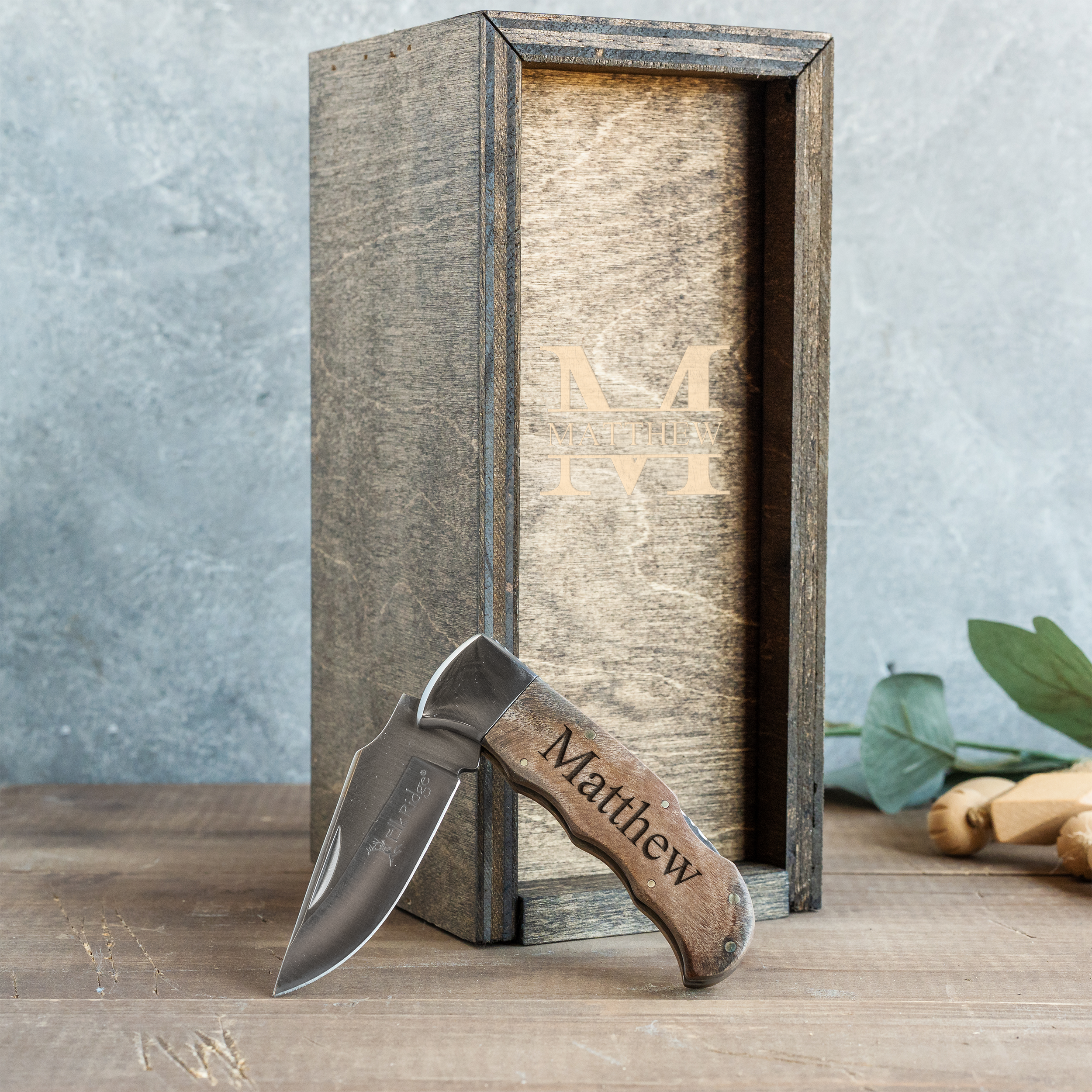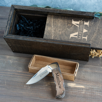 Give a meaningful gift with this premium pocket knife and custom wooden gift box! The knife can be engraved on both the blade and handle with your personal message, name, or design.