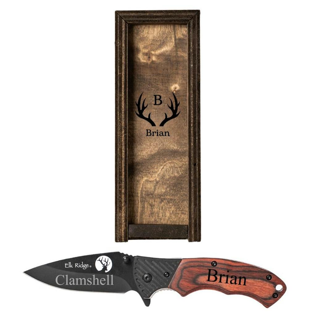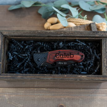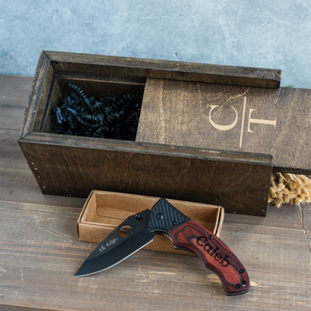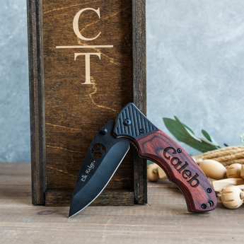 Give a meaningful gift with this premium pocket knife and custom wooden gift box! The knife can be engraved on both the blade and handle with your personal message, name, or design.