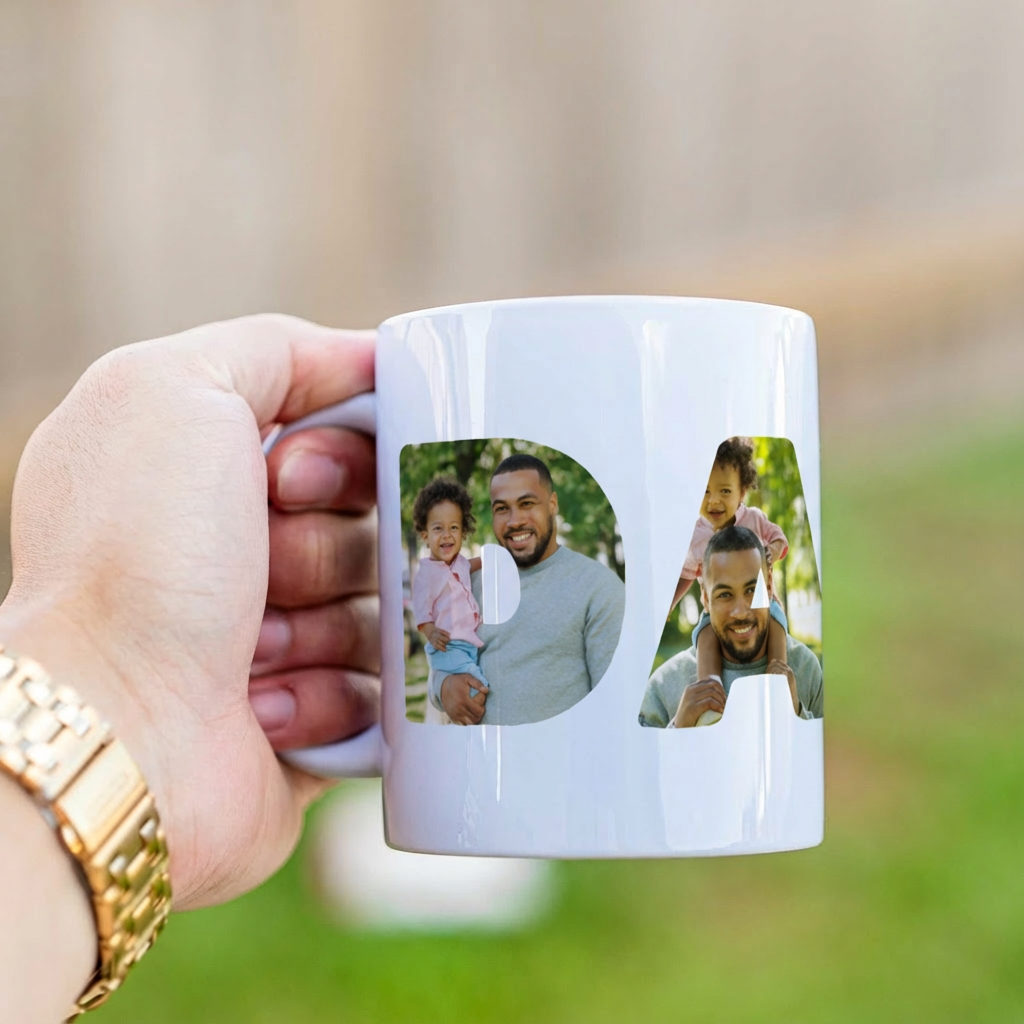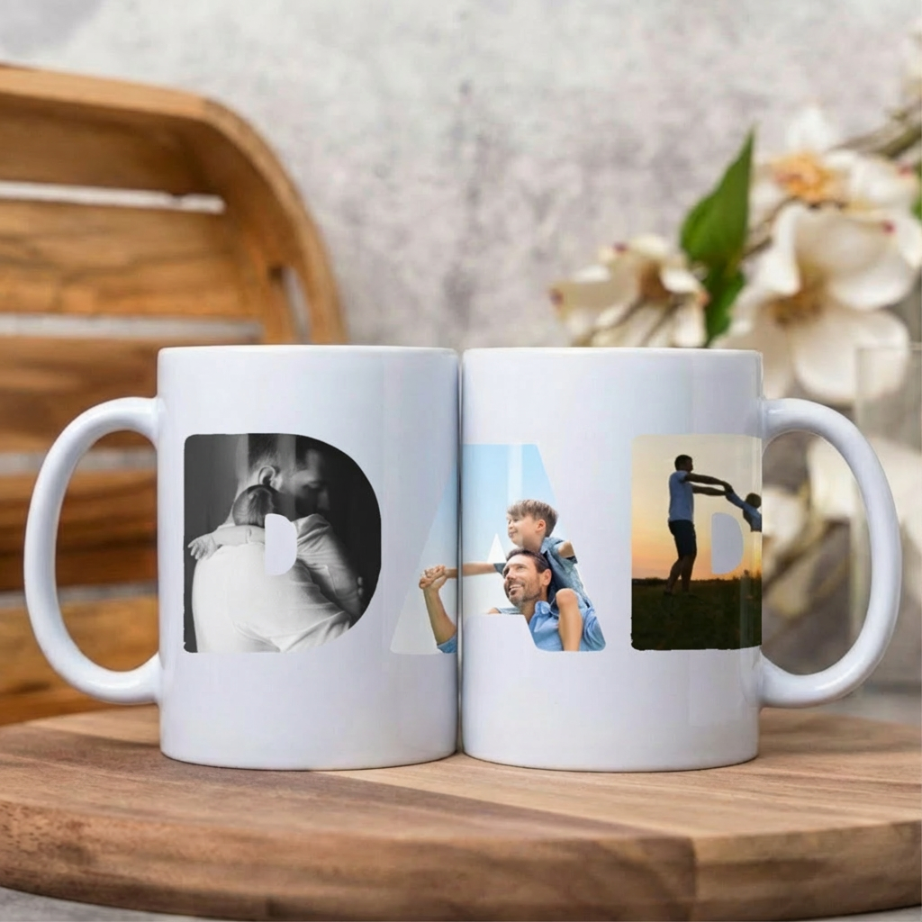 Celebrate Dad with a one of a kind mug he will use every day. This white 11oz ceramic mug features the word DAD boldly sublimated on the front, with a custom photo beautifully placed inside each letter. The result is a meaningful, personal gift that turns favorite memories into something practical and heartfelt.