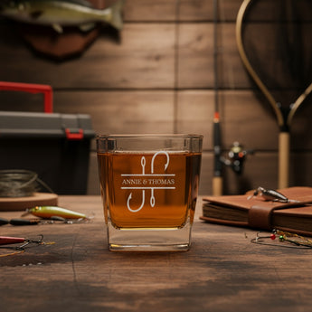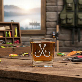 Enjoy your favorite drink in style with this custom engraved square whiskey glass! This classic lowball glass features one of our unique fishing designs permanently engraved into the glass. Perfect for the fisherman who loves a good drink after a day on the water.