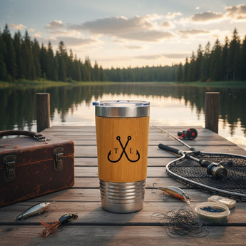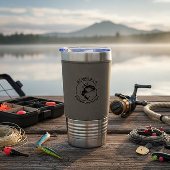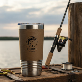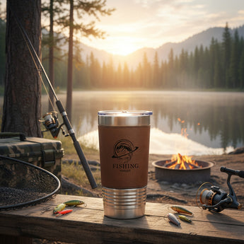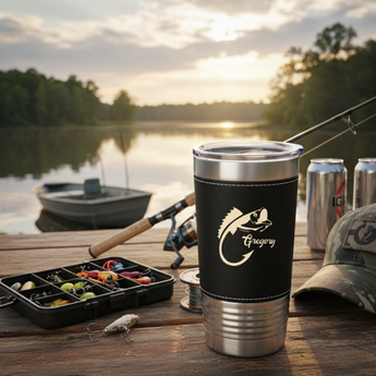 This double-walled tumbler keeps drinks ice cold for hours or hot beverages steaming throughout your fishing trip. The vegan leather wrap provides a comfortable grip and adds rustic outdoor style. The permanent engraving won't fade or wear away, even with daily use and outdoor adventures.