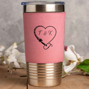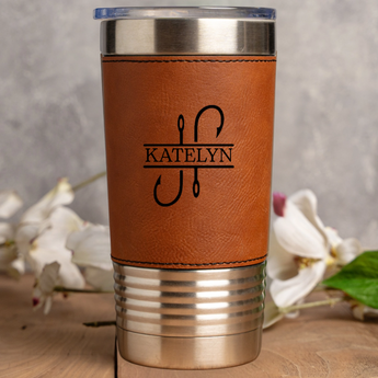 Stay refreshed on the water with this rugged leather wrapped tumbler! This premium insulated tumbler features vegan leather wrapping and one of our unique fishing designs engraved into the leather. Perfect for the fisherman who needs drinks to stay cold during long days of casting and reeling.