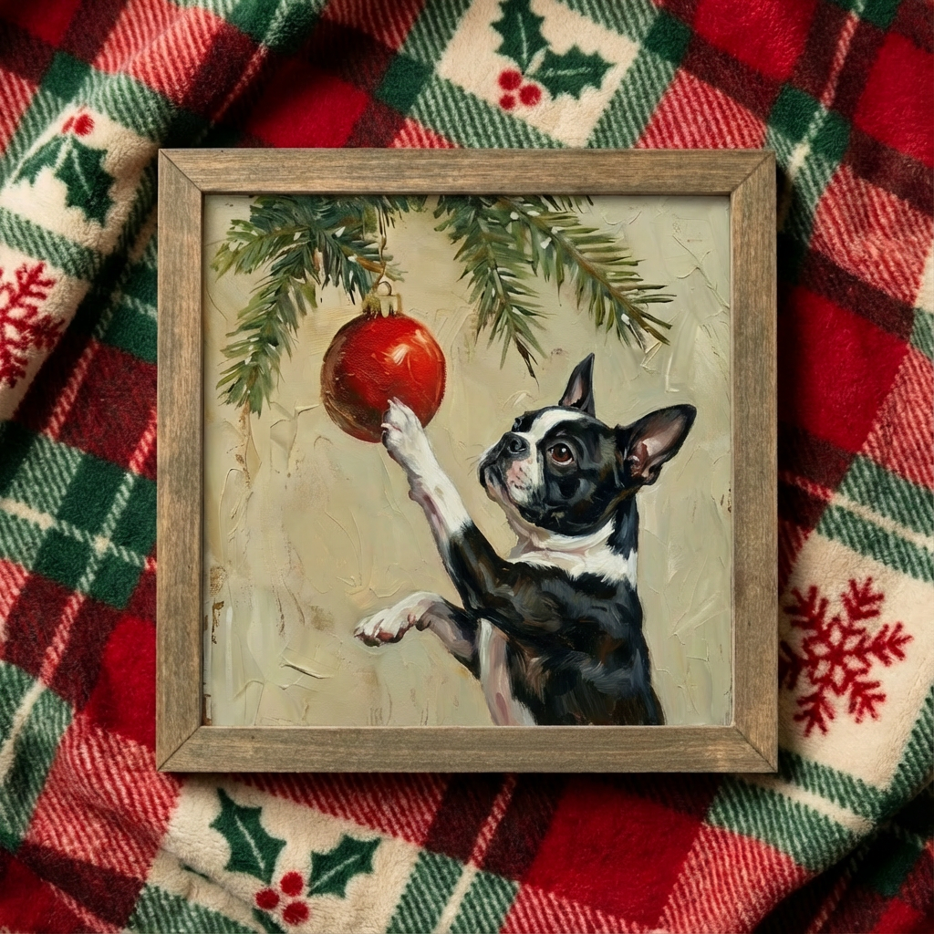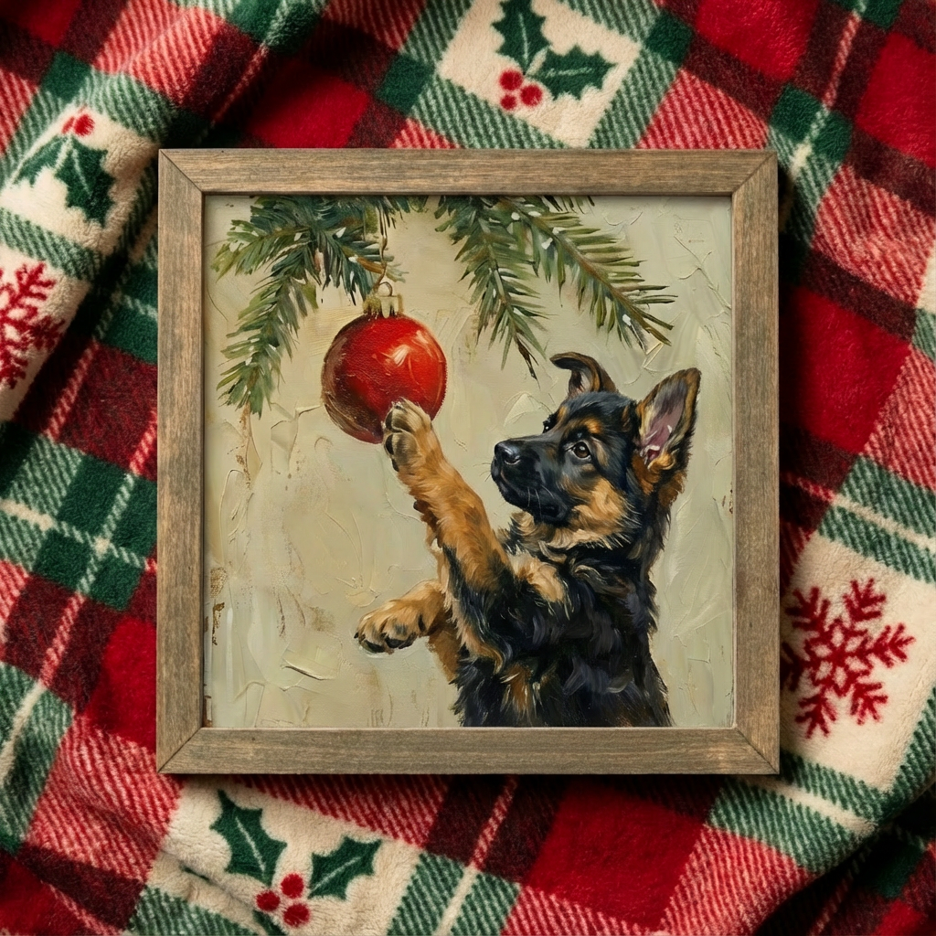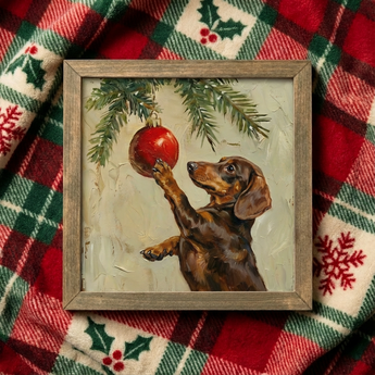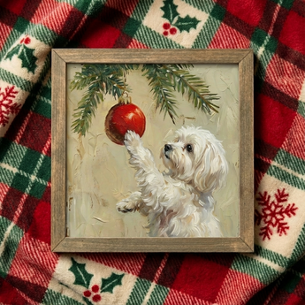 Add holiday charm to your home with this adorable framed dog print! This delightful artwork features a playful puppy reaching up to bat at a Christmas ornament, capturing the fun and mischievous spirit pets bring to the holiday season. It's perfect for dog lovers who want to celebrate Christmas with their furry best friends!