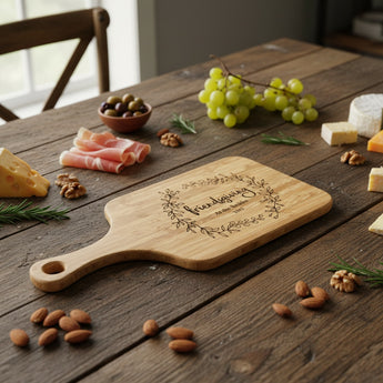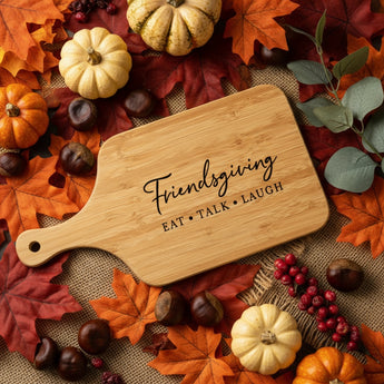 Celebrate Friendsgiving in style with this beautiful dual-purpose cutting board! This versatile bamboo board features one of our festive Friendsgiving designs engraved on the surface. Use it for food prep in the kitchen or to create a stunning charcuterie display for your gathering.