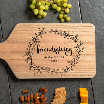 Celebrate Friendsgiving in style with this beautiful dual-purpose cutting board! This versatile wooden board features one of our festive Friendsgiving designs engraved on the surface. Use it for food prep in the kitchen or to create a stunning charcuterie display for your gathering.