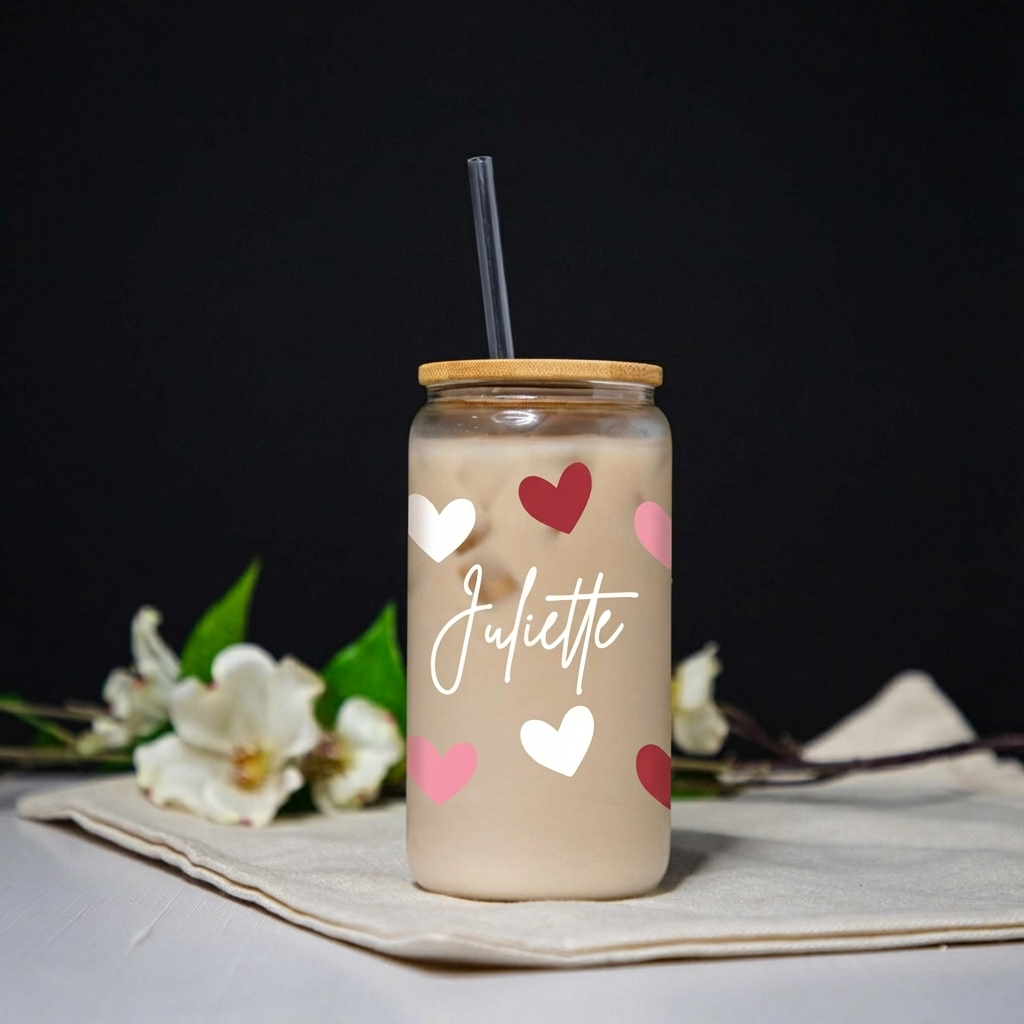 Celebrate Galentine’s Day with a cute and custom Glass Can Cup! Each cup comes with a bamboo lid and straw, and you can choose between a clear or frosted finish. Add your name inside heart designs to make it your own — or create the perfect gift for your best friends.