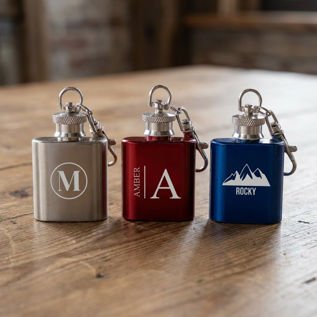Keep your favorite spirits close at hand with our personalized keychain flask! This compact stainless steel flask can be laser-engraved with your name, initials or custom message to create a unique portable flask that's perfect for any adventure.