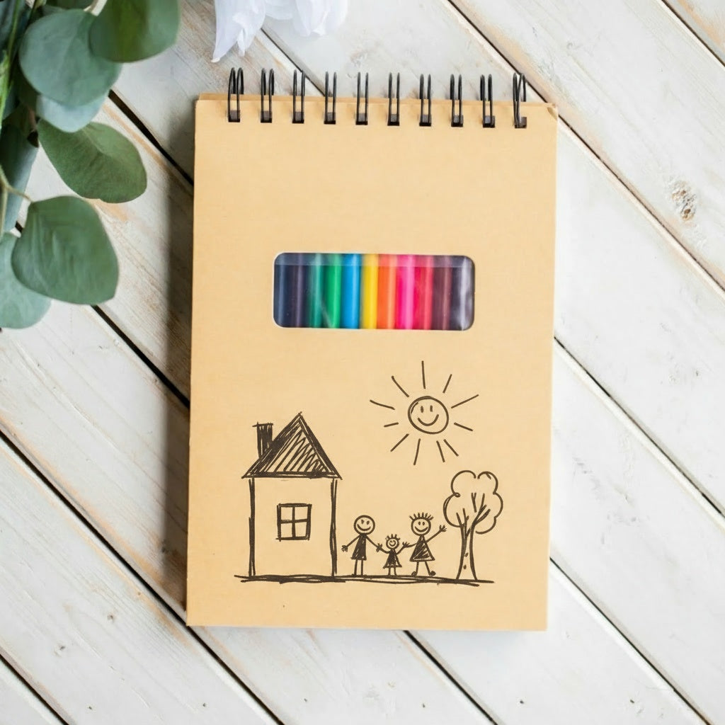 The cover is beautifully engraved with your child's actual artwork, making it one-of-a-kind. Inside are plenty of blank pages for drawing, coloring, and creating new masterpieces. The included colored pencils mean your child can start creating right away. It's perfect for car rides, quiet time, or anytime inspiration strikes!
