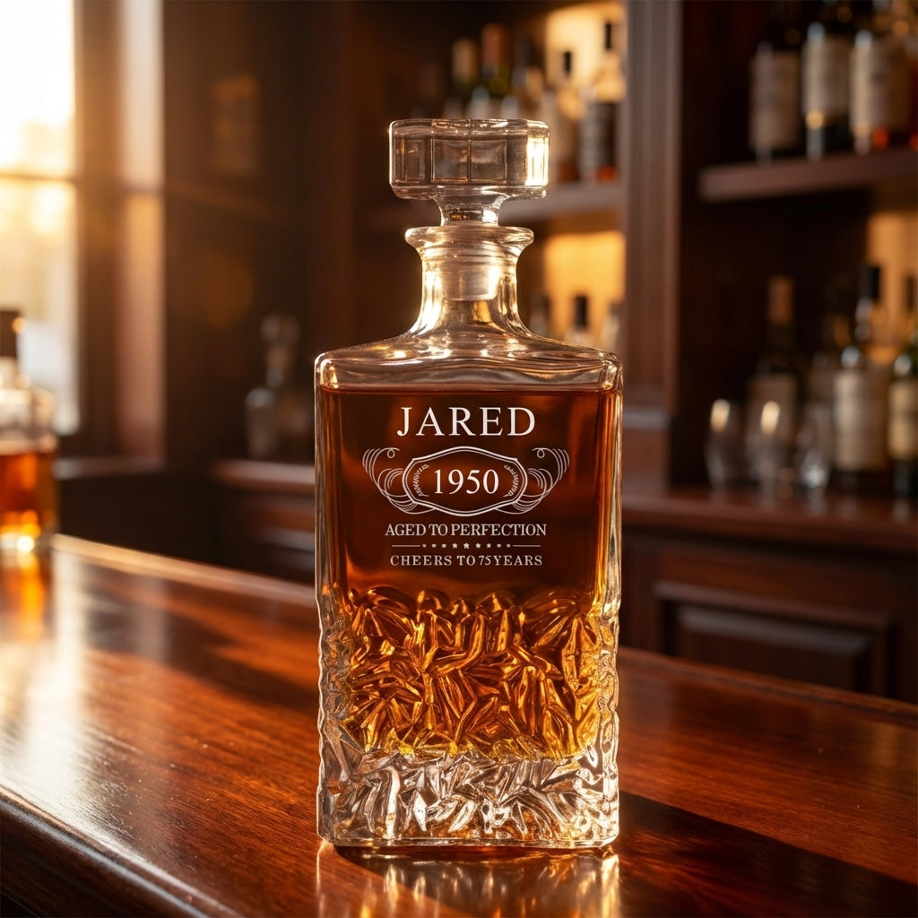Celebrate your special year with this elegant custom decanter! Features your name, birth year, and "Aged to Perfection, Cheers to ___ Years" with your current age printed beautifully on premium glass.