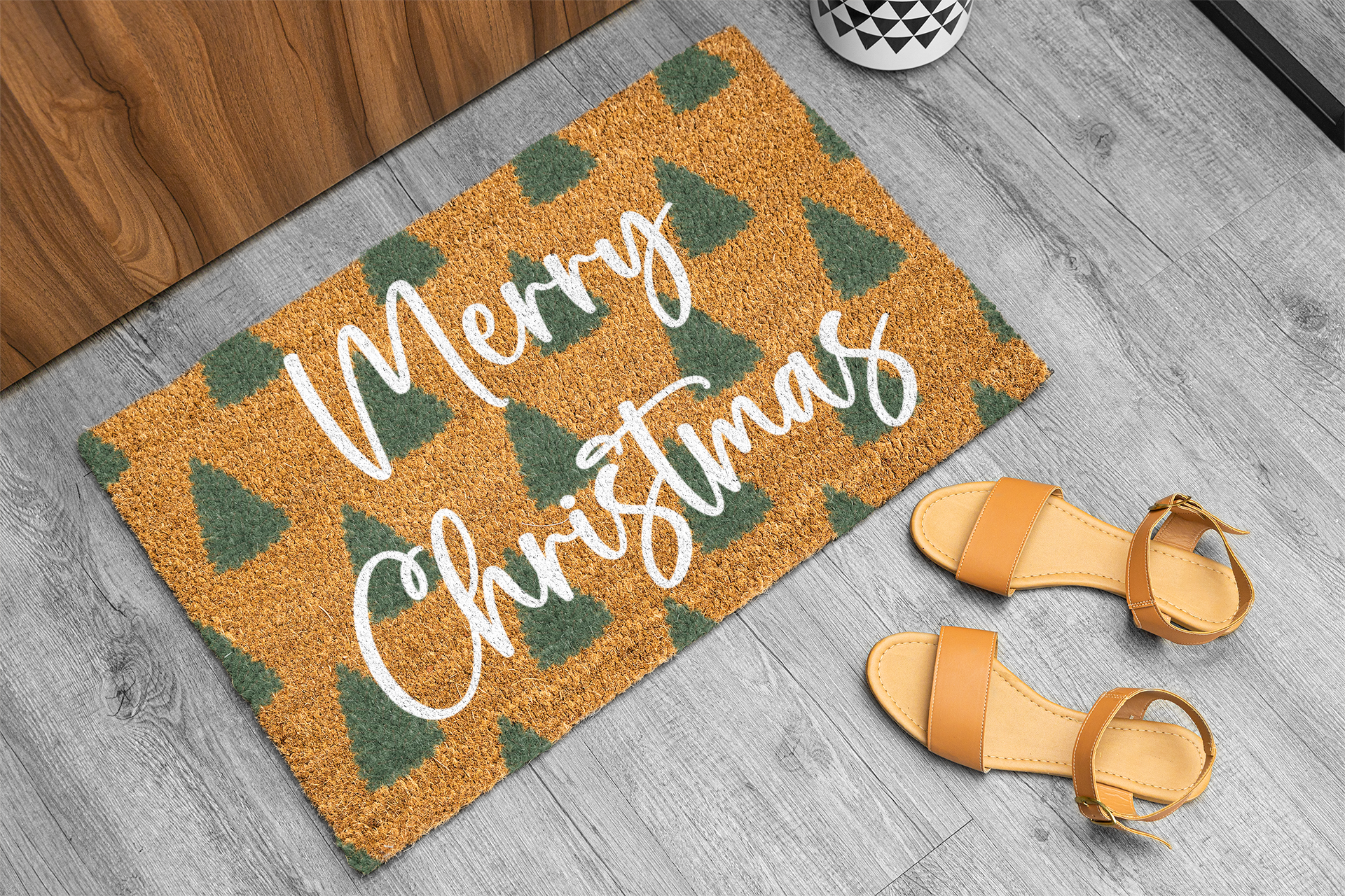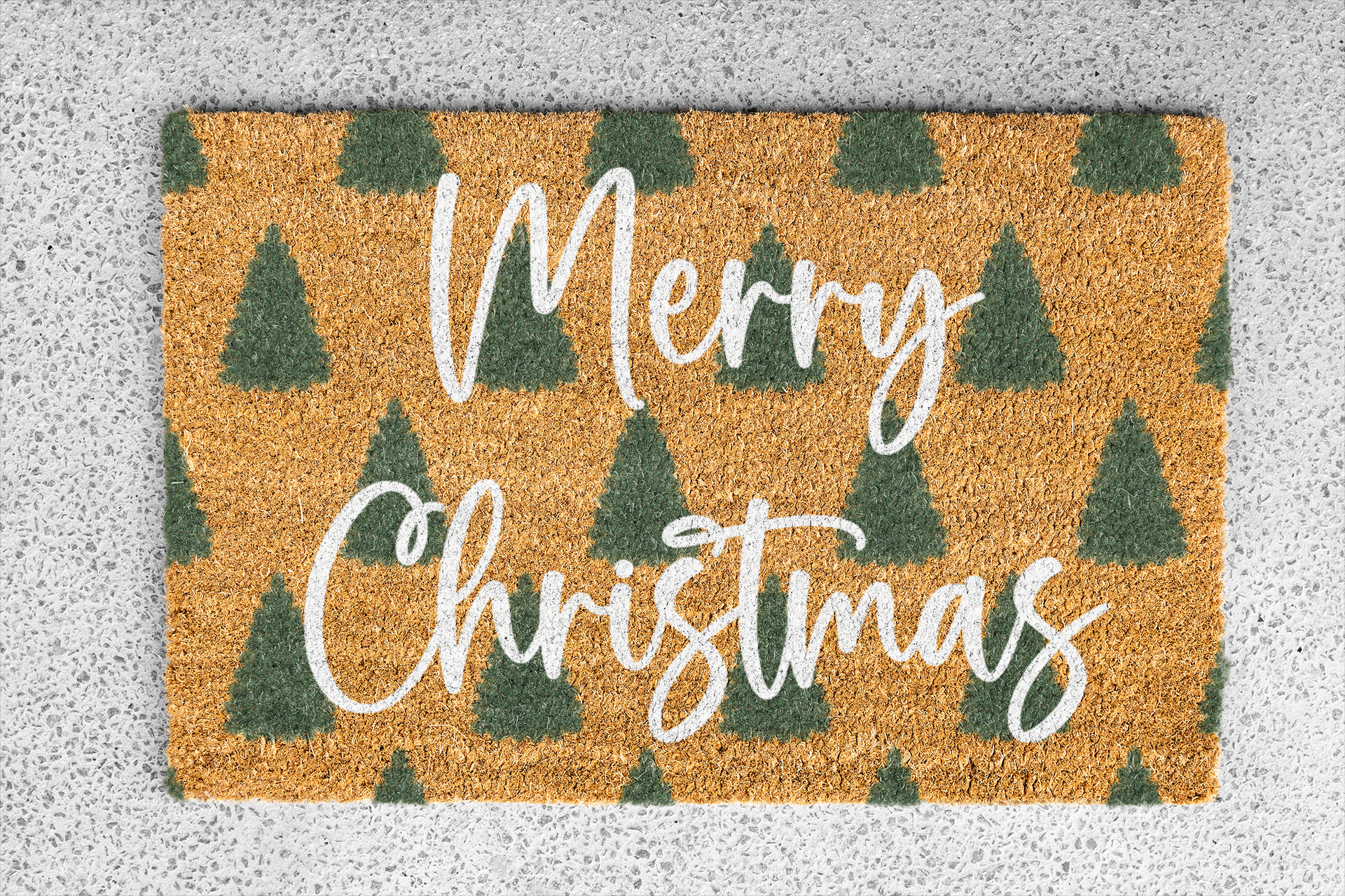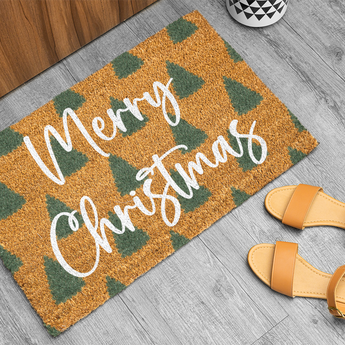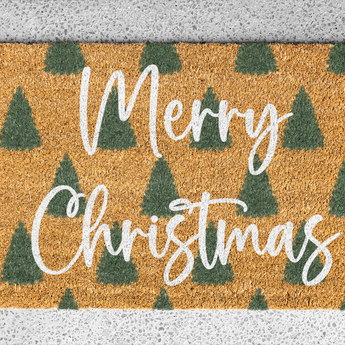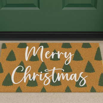 Bring festive cheer to your entryway with this Merry Christmas doormat, featuring bold white script and a background of green Christmas trees. Made from natural coir fibers with a sturdy non-slip backing, this mat is both decorative and functional—keeping dirt outside while creating a warm, holiday-ready welcome.