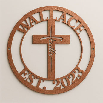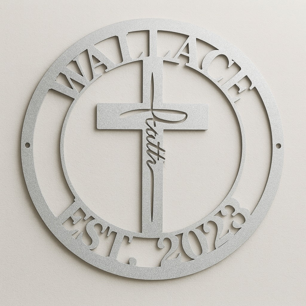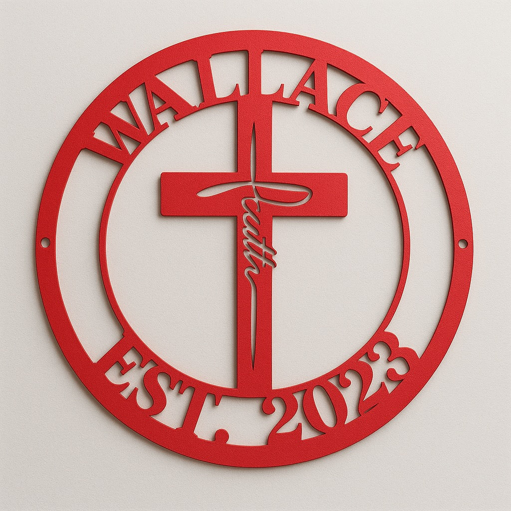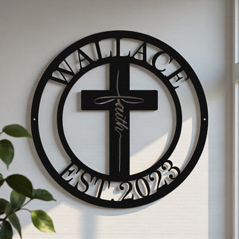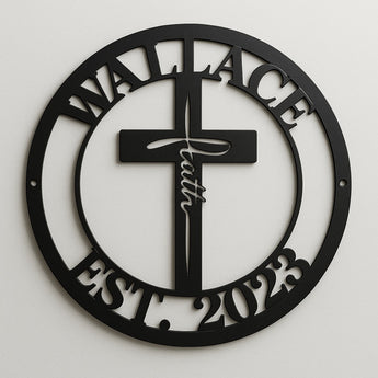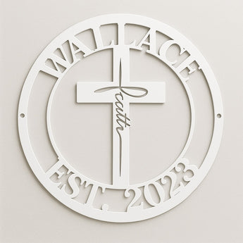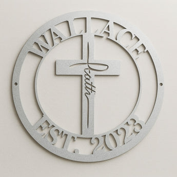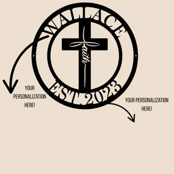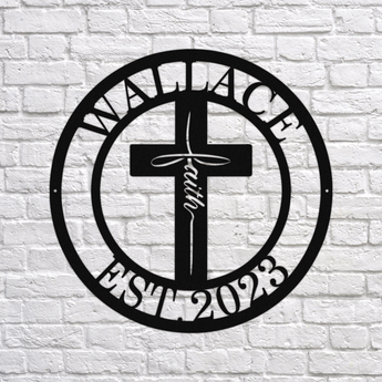 Show your family's faith and pride with this beautiful custom metal sign. This special piece features your family name at the top, your established date at the bottom, and a cross in the center with the word "Faith" written inside. It's a meaningful way to display what matters most to your family.