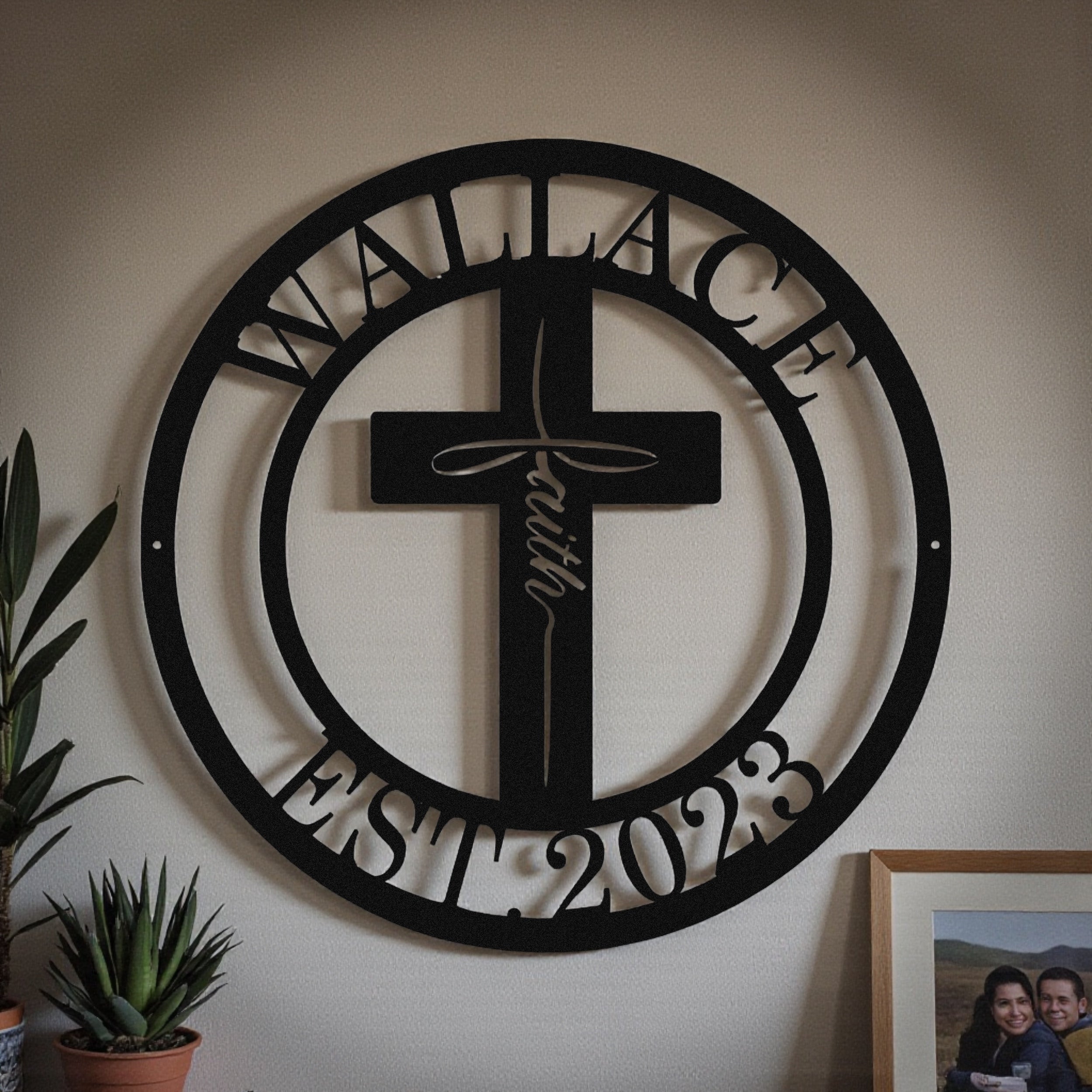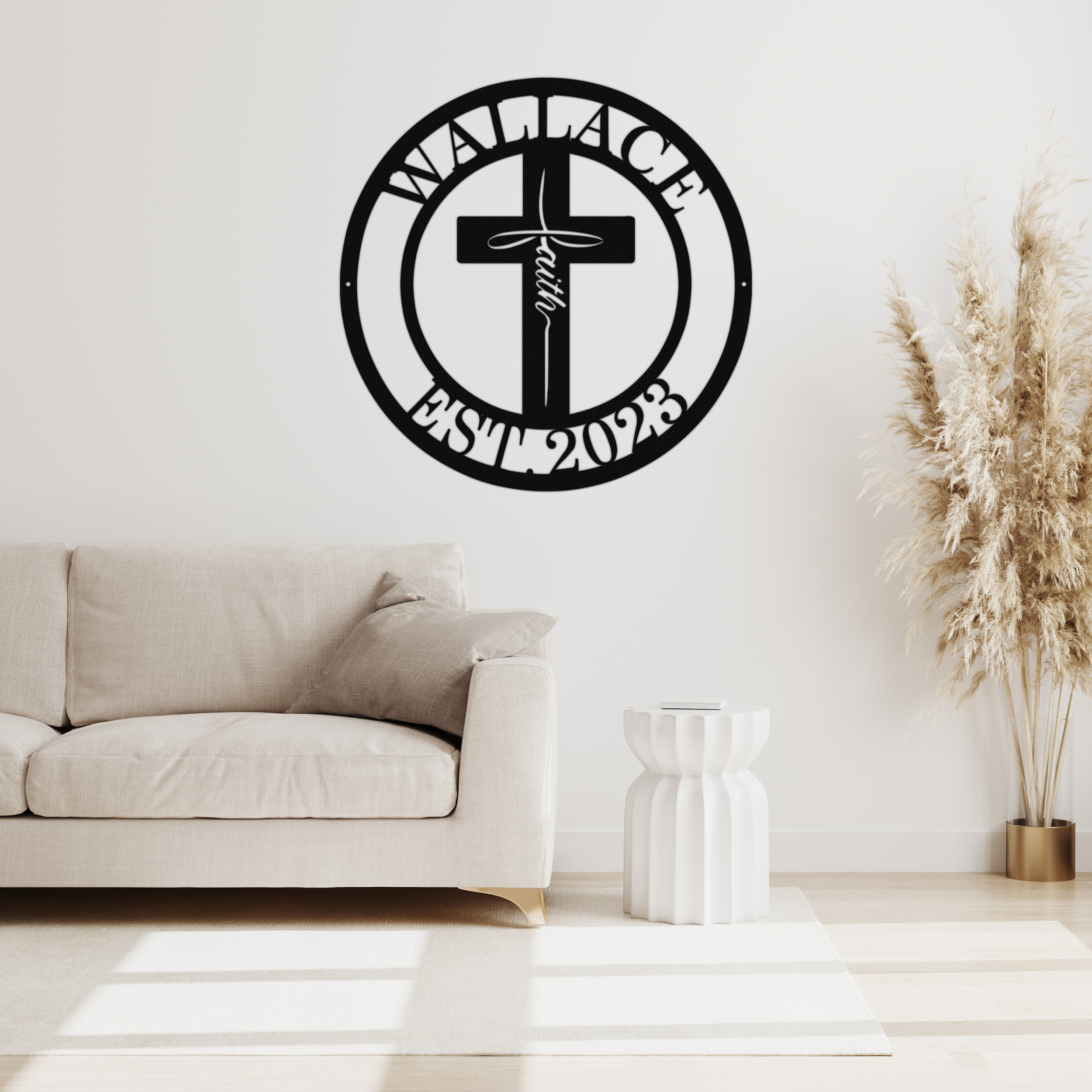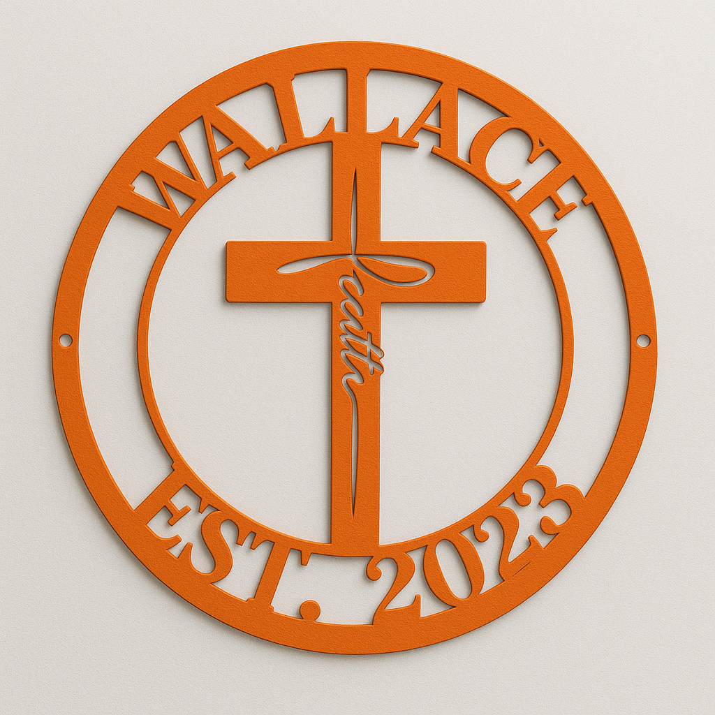 Show your family's faith and pride with this beautiful custom metal sign. This special piece features your family name at the top, your established date at the bottom, and a cross in the center with the word "Faith" written inside. It's a meaningful way to display what matters most to your family.