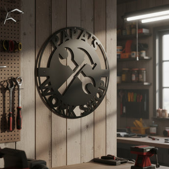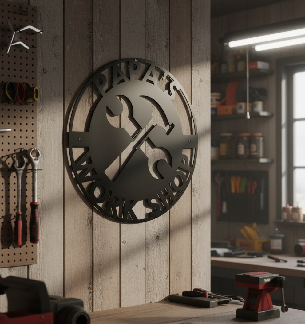 Make your workshop truly yours with this custom metal sign! This rugged design features crossed wrench and hammer tools, with your name at the top and "Workshop" at the bottom. It's perfect for garages, tool sheds, man caves, or any workspace where you build and create!