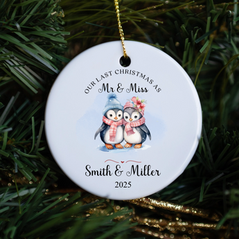 Celebrate your love story with this special Christmas ornament! Choose between "Our Last Christmas as Mr. and Miss" or "Our First Christmas as Mr. and Mrs." with your names printed in beautiful lettering.