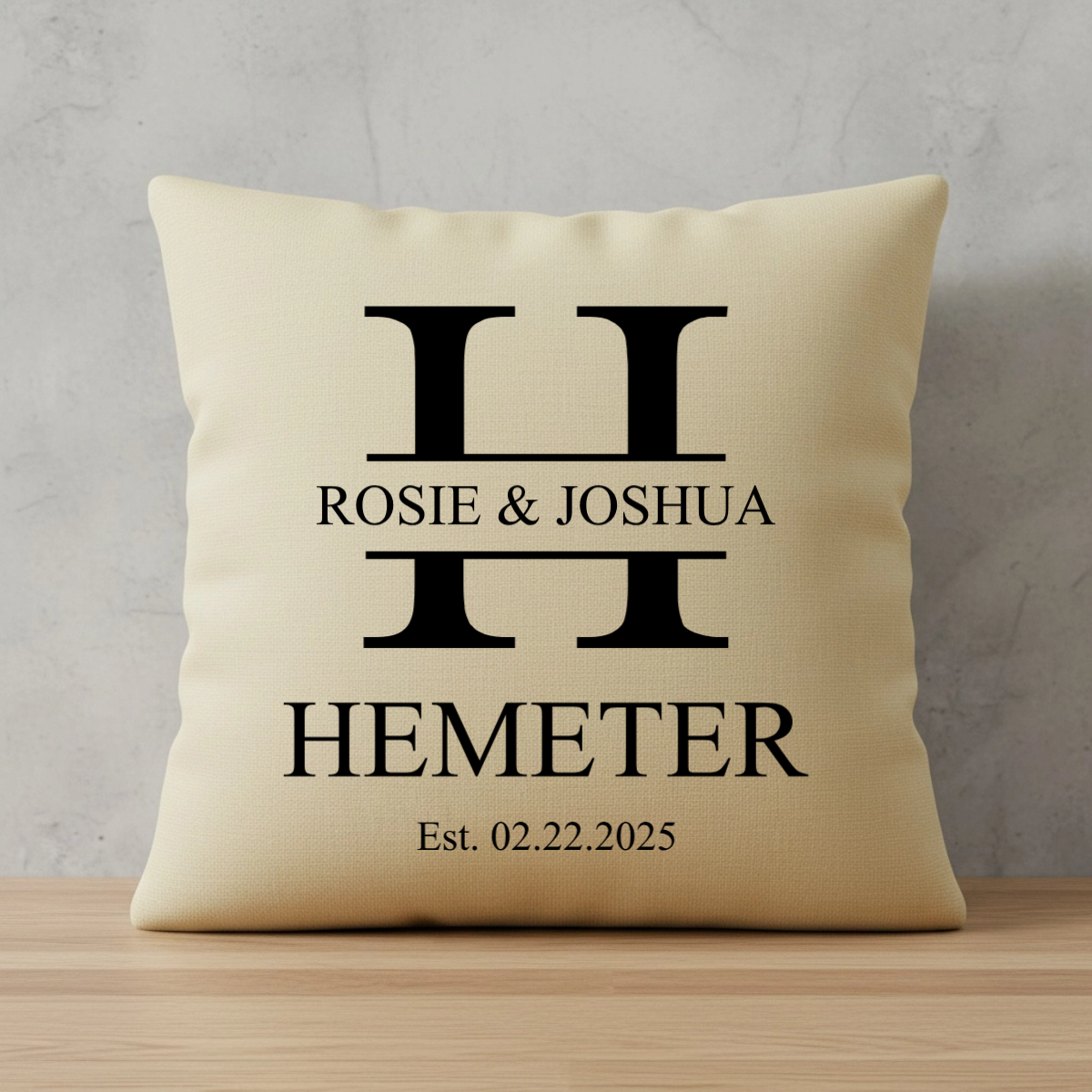 Celebrate your love story with this beautiful personalized pillow cover! This elegant beige throw pillow can be printed with your first names, last name initial, full last name, and wedding date. It's perfect for newlyweds, anniversaries, bridal showers, or engagement gifts!