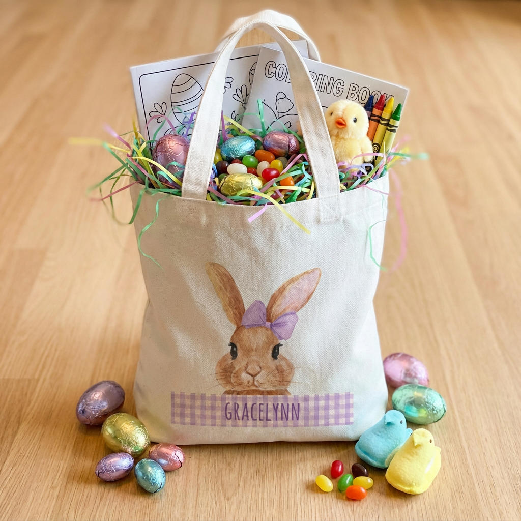 Make Easter extra fun with this Kids Easter Tote Bag, featuring one of our adorable Easter designs made just for kids. This reusable tote is the perfect alternative to a traditional Easter basket and is great for egg hunts, candy, toys, and springtime surprises.