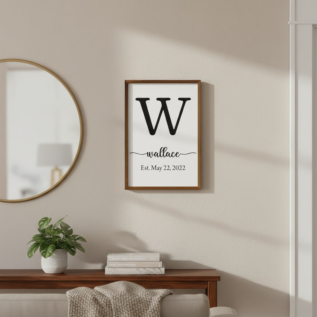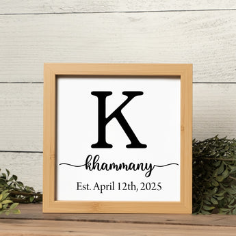 Display your family pride with this beautiful wood framed artwork! This elegant piece features your family name, monogram initial, and established date all in one stunning design. The natural wood frame adds warmth and charm to any room in your home!