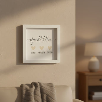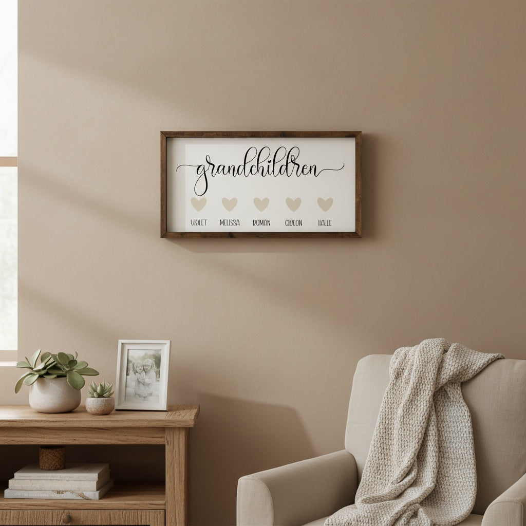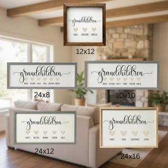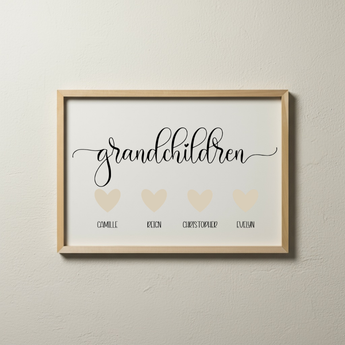 Celebrate your precious grandchildren with this heartwarming wood framed artwork! This beautiful piece features the word "Grandchildren" at the top with each grandchild's name listed below, accompanied by sweet hearts. It's a touching way to display your love for every grandchild in your family!