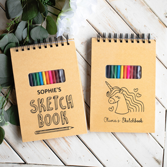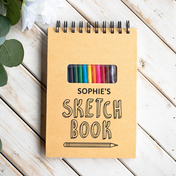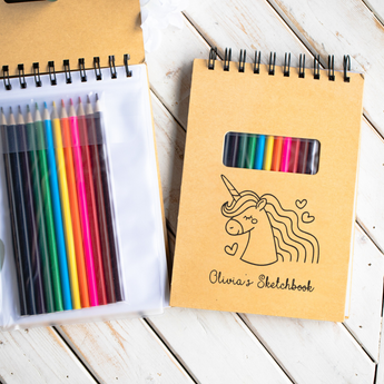 Spark your child's creativity with this fun personalized sketch pad. This awesome kids' sketch pad can be laser-engraved with your child's name and special design, plus comes with a complete set of bright colored pencils perfect for little hands. This is a great back-to-school gift for kids. With a set of coloring pencils readily accessible at the front of the book, you’ll have everything you need to draw to your heart’s content.