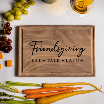 Celebrate Friendsgiving in style with this beautiful dual-purpose cutting board! This versatile wooden board features one of our festive Friendsgiving designs engraved on the surface. Use it for food prep in the kitchen or to create a stunning charcuterie display for your gathering.