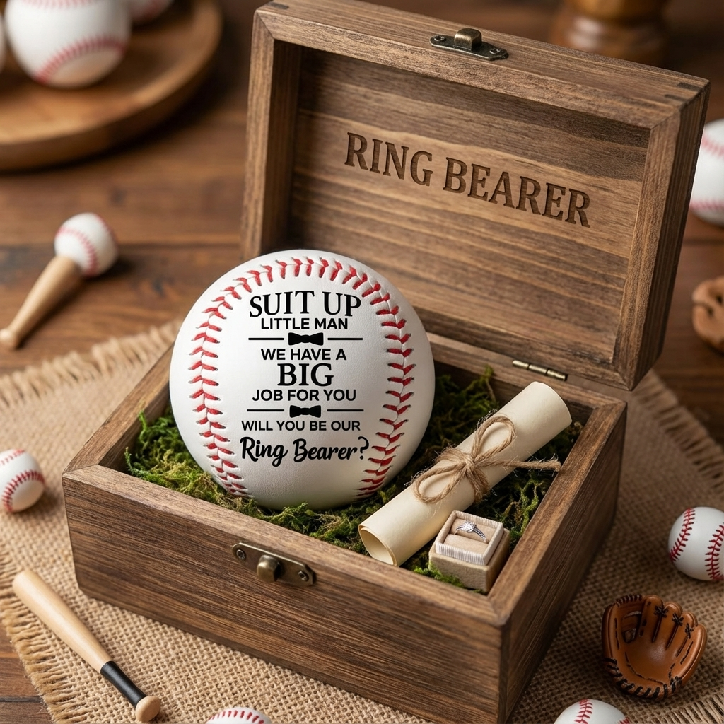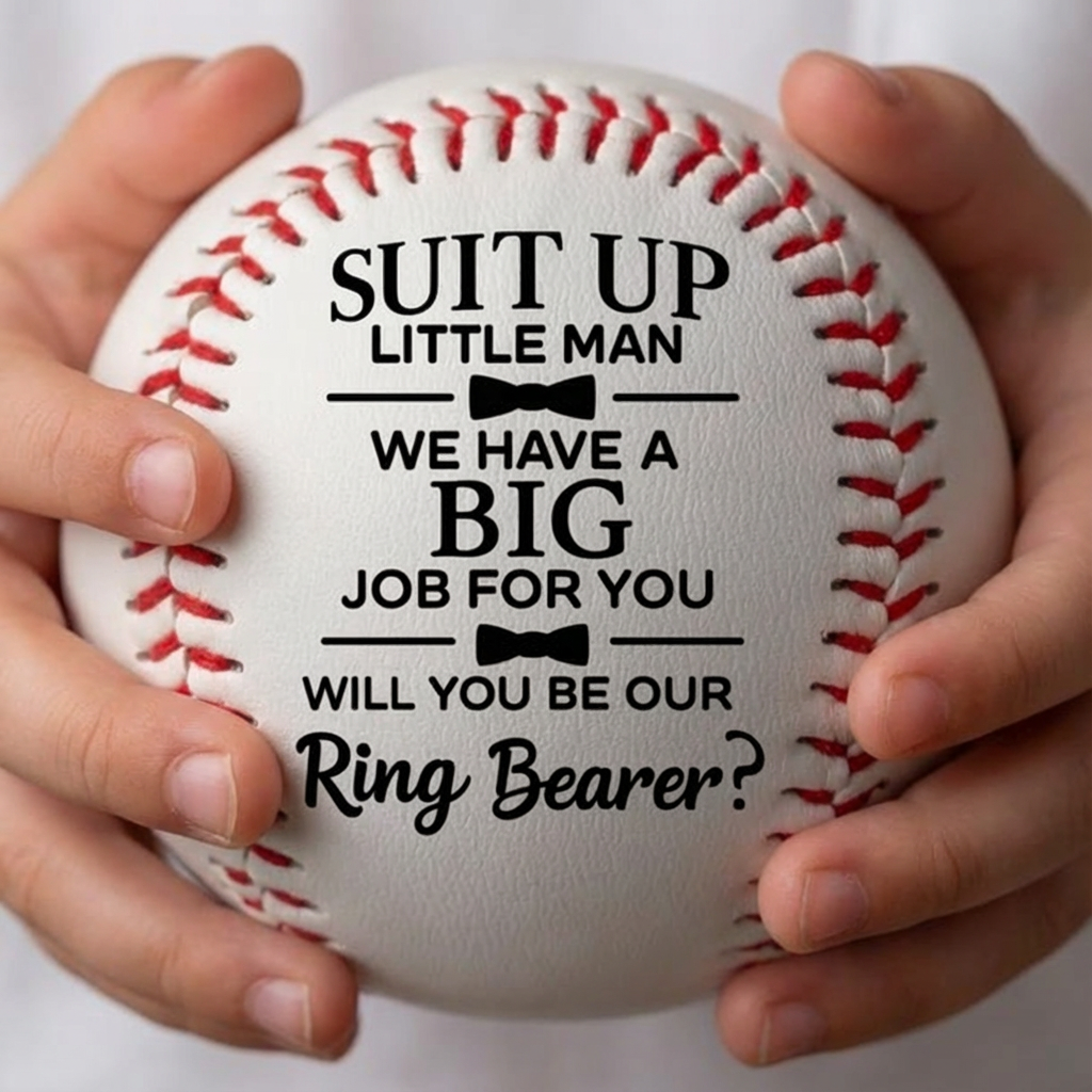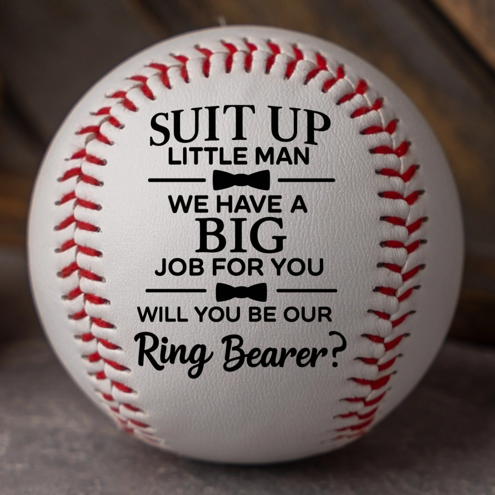 Ask your special little guy to be your ring bearer with this adorable baseball! This fun keepsake features a ring bearer proposal message printed right on the ball. It's the perfect way to invite your nephew, son, godson, or young friend to be part of your big day!