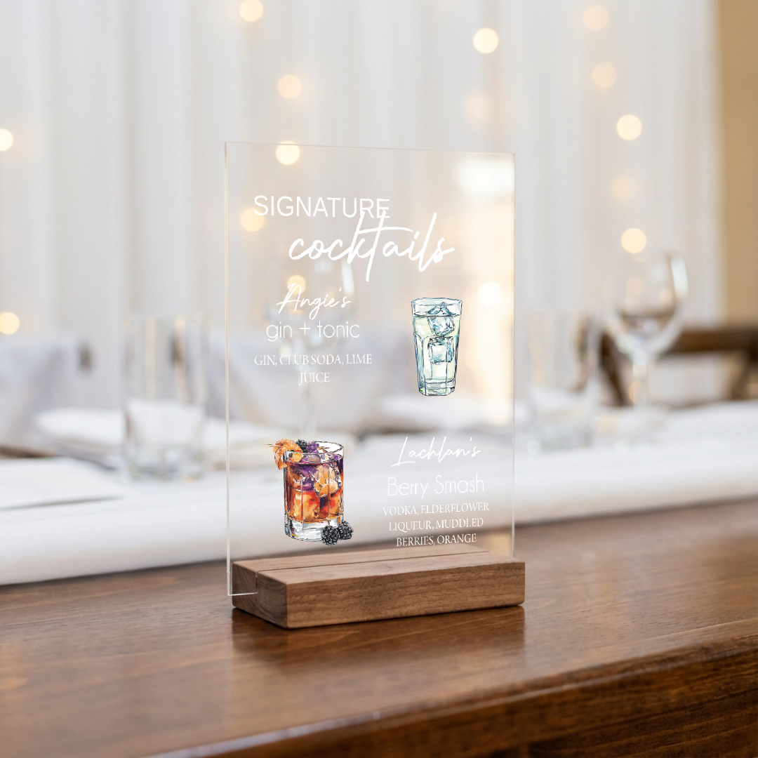Show off your special drinks with this elegant signature cocktails acrylic sign! This beautiful display features your custom wedding cocktails with names, ingredients, and descriptions. Perfect for your bar area, cocktail hour, or reception to let guests know what delicious drinks you're serving!