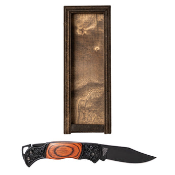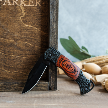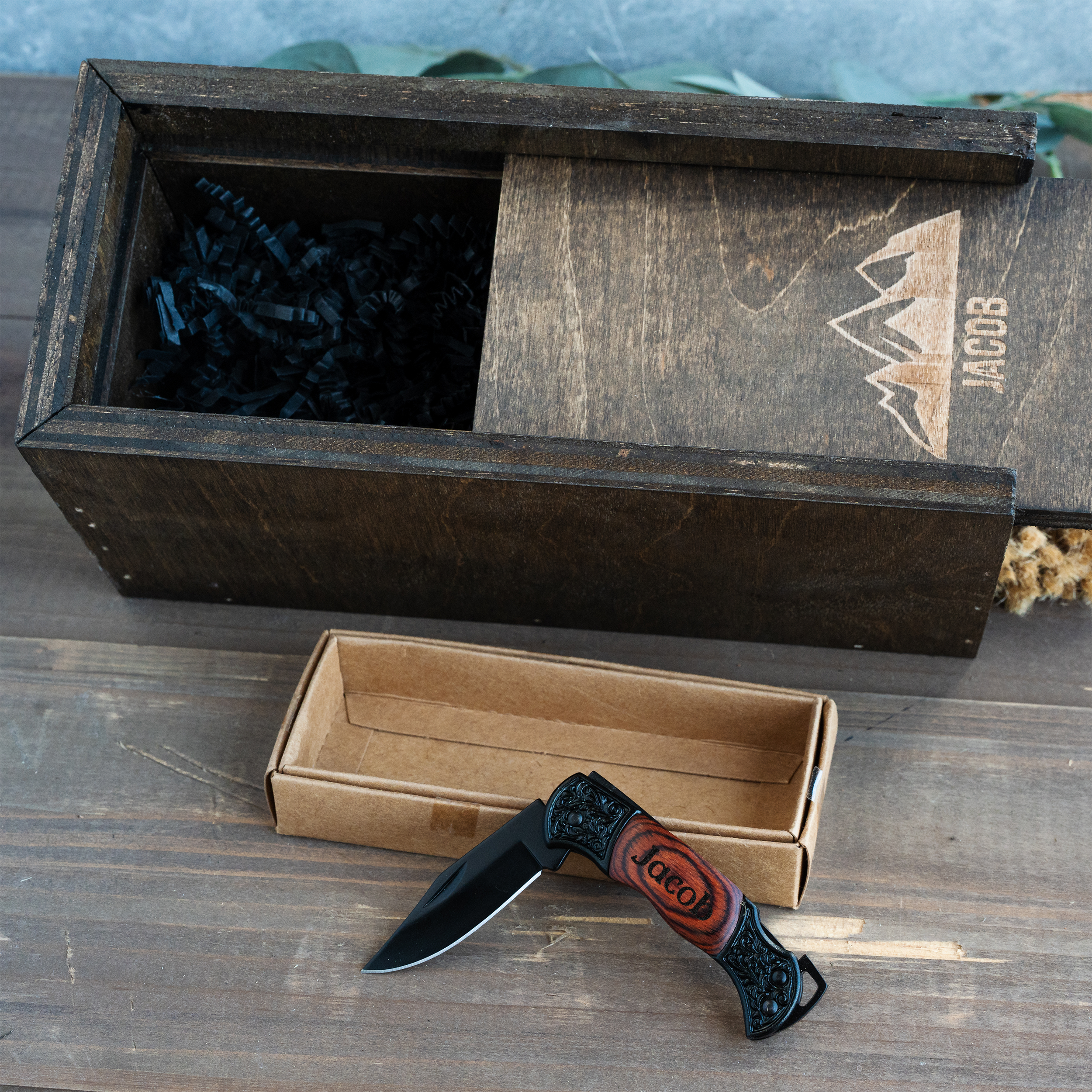 Give a meaningful gift with this premium pocket knife and custom wooden gift box! The knife can be engraved on both the blade and handle with your personal message, name, or design.