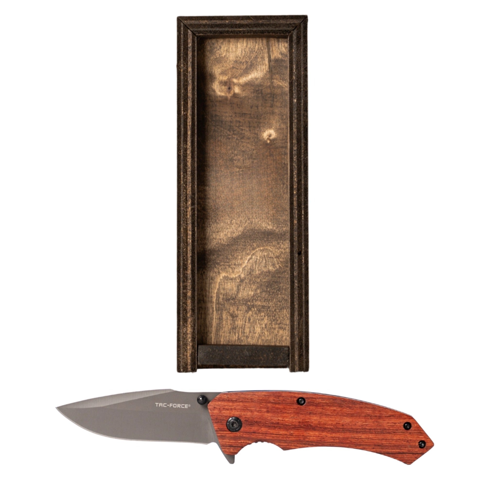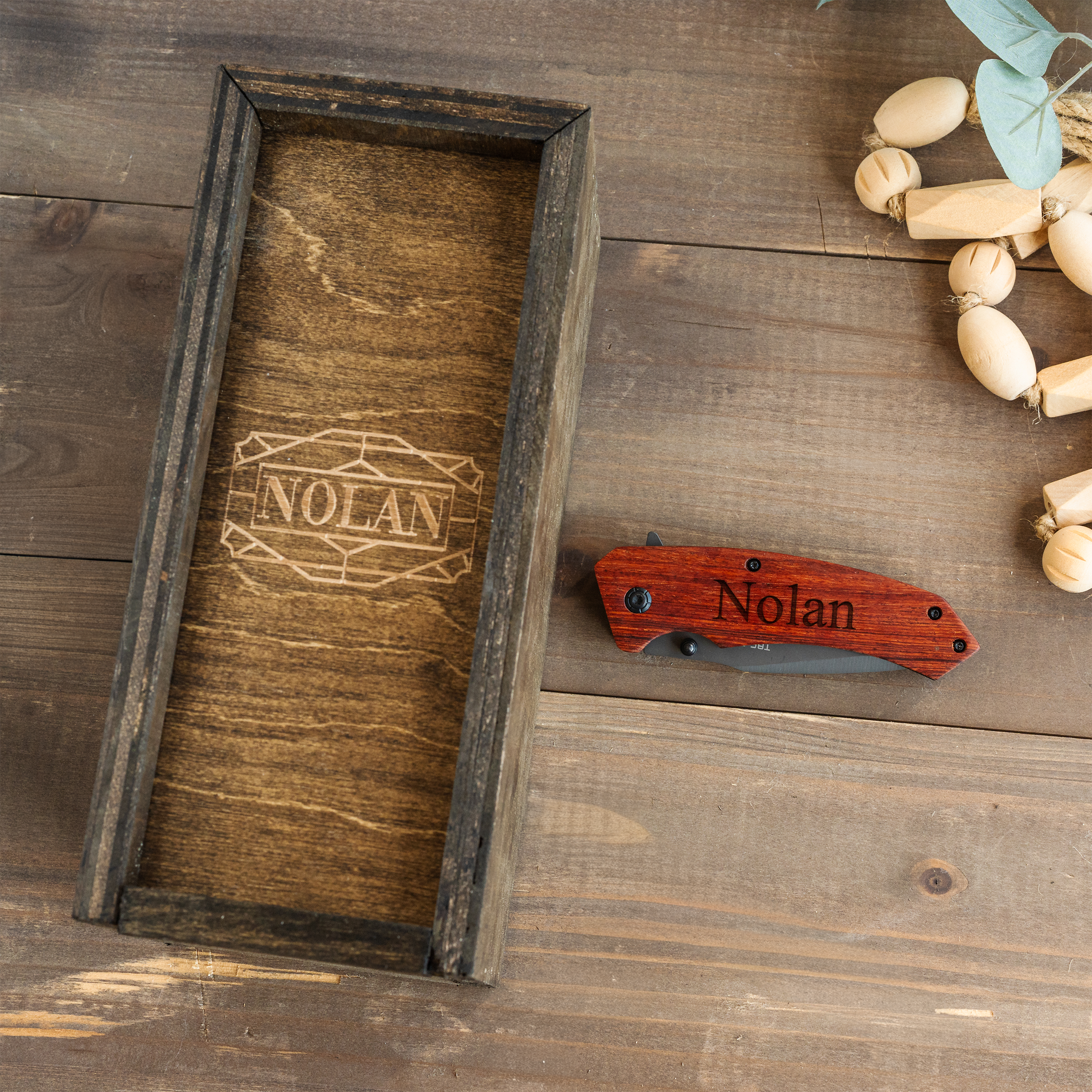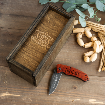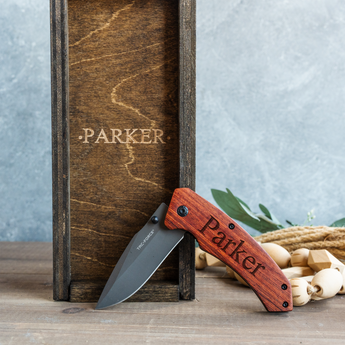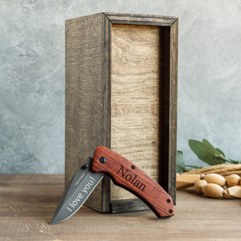 Give a meaningful gift with this premium pocket knife and custom wooden gift box! The knife can be engraved on both the blade and handle with your personal message, name, or design.