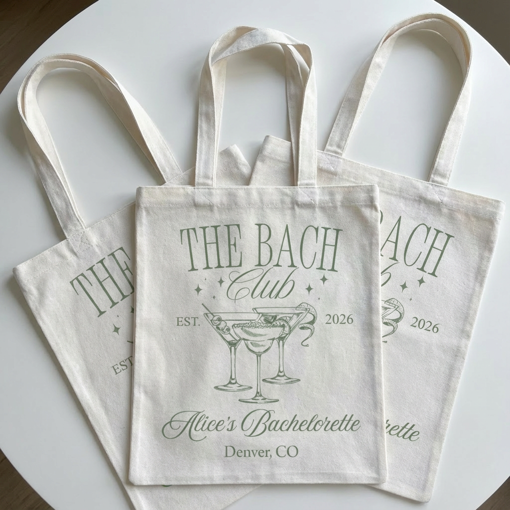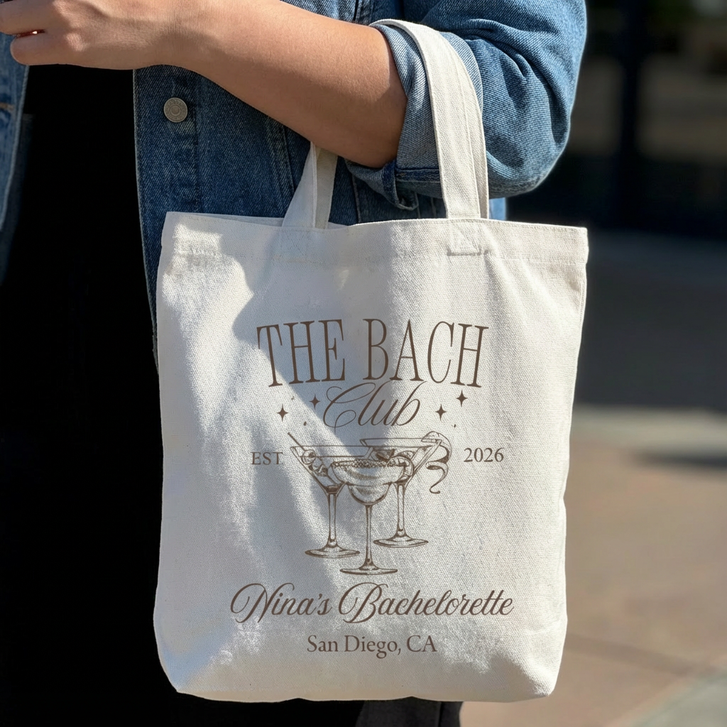 Celebrate the bride-to-be with this fun custom bachelorette party tote bag! This bag features our festive bachelorette designs printed right on it to capture the excitement of your celebration!