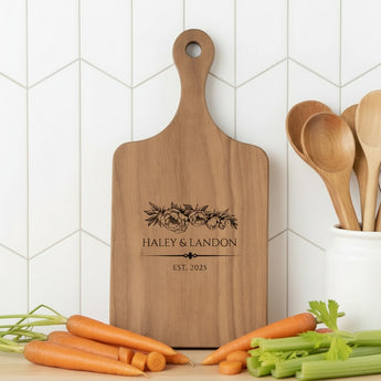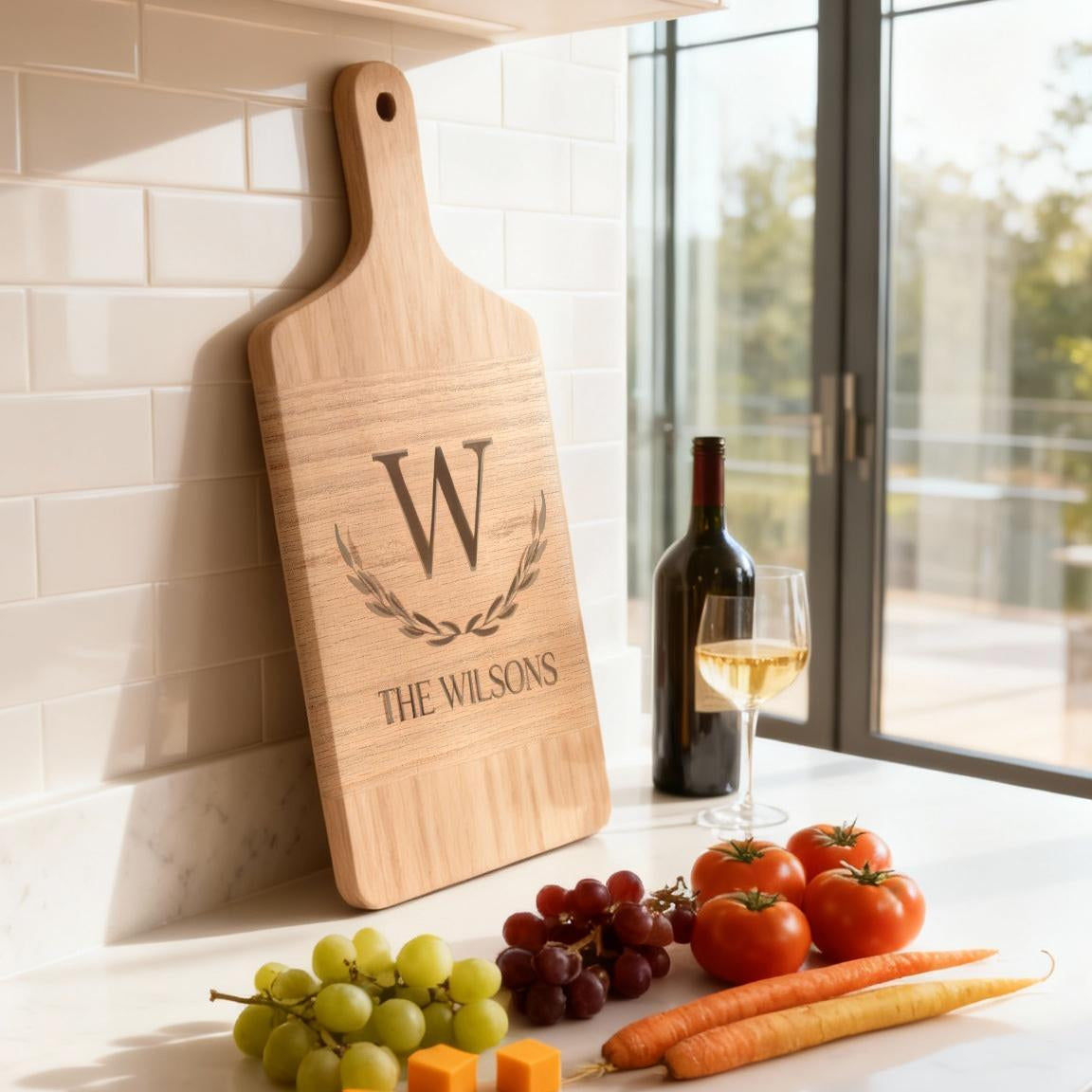 Transform your kitchen with this beautiful paddle cutting board featuring custom engraving options! This versatile wooden paddle board is perfect for food prep, serving cheese and appetizers, or displaying as kitchen decor. Choose from our collection of custom designs to create a personalized piece.