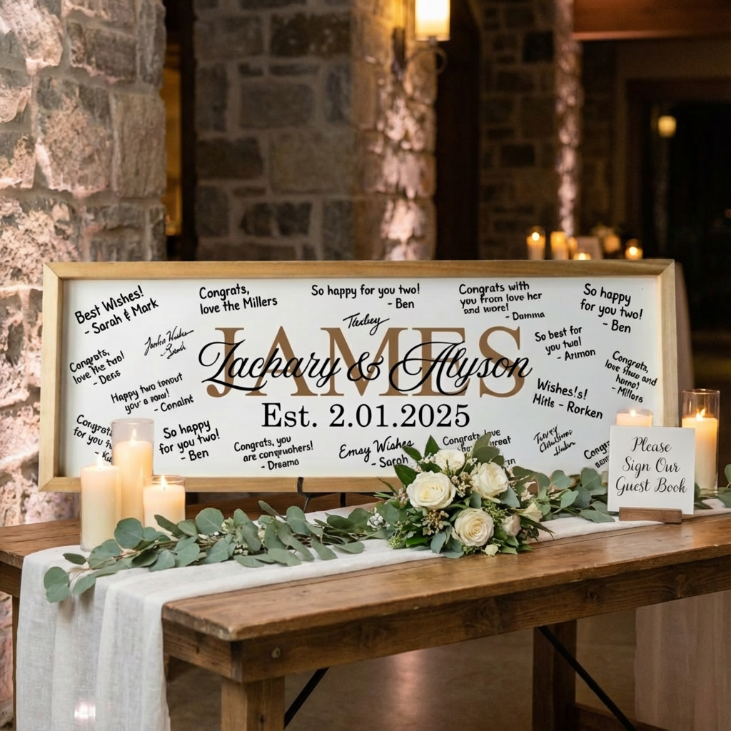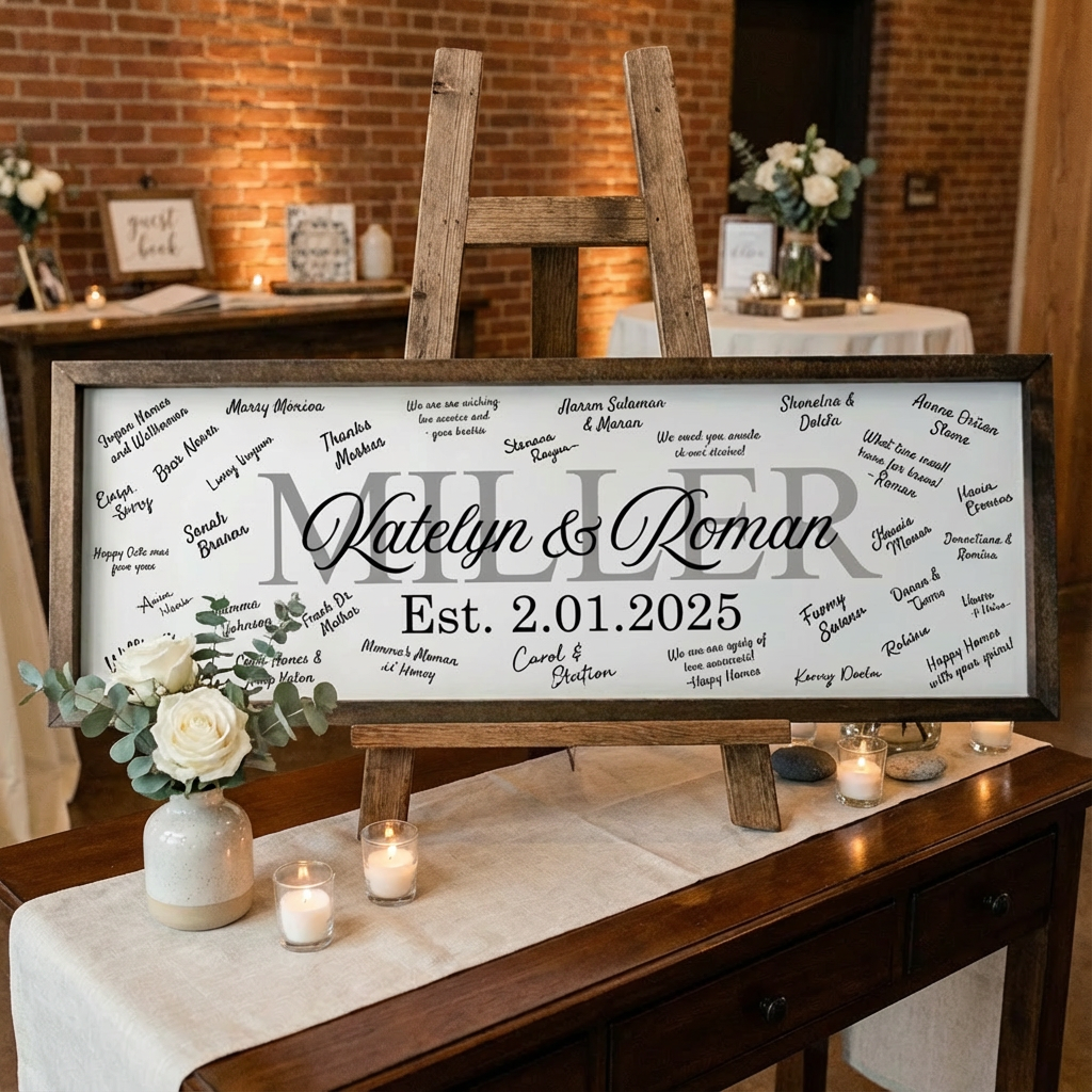 Create lasting memories with this beautiful wooden framed guest book sign! This elegant piece features you and your partner's first and last names with plenty of white space around them for guests to sign. It's a unique alternative to traditional guest books that becomes stunning wall art after your wedding!