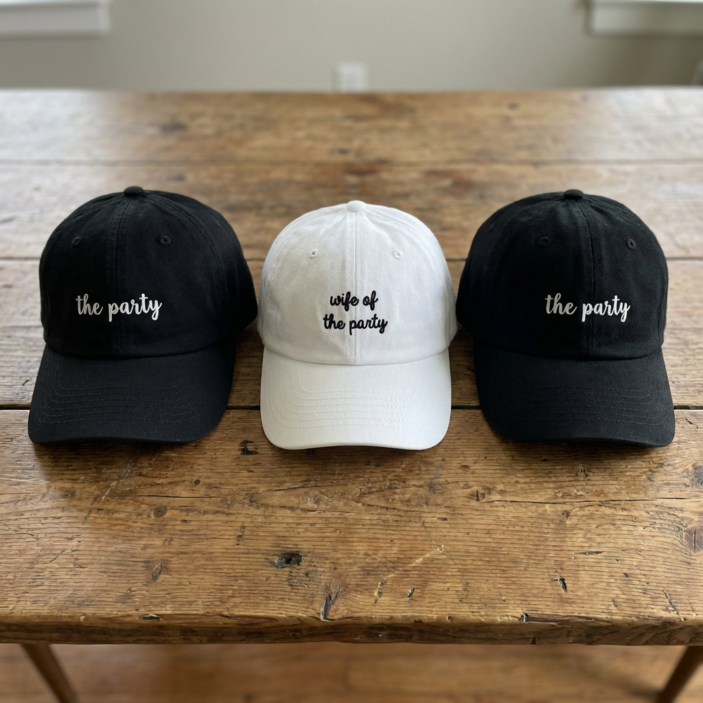 Celebrate in style with these fun bachelorette party baseball caps! These cute hats can be embroidered with either "The Wife of the Party" for the bride or "The Party" for the bridesmaids. Perfect for your girls' trip, bachelorette weekend, or any pre-wedding celebration!